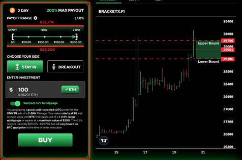 选Stay In的订单成交后,你的初始价值将从0开始累计,当累计时间达到1天时, 累计的价值会达到本金的100%价值,如果能累计到第二天到期时间,将会达到本金的200%价值。比如,买入100 USD,当BTC的价格一直保持在你所开单的价格区间范围内直到24小时,你累计的价值将达到100 USD,以后持续保持在价格区间范围内的话累计的价值都将是盈利,最高到2天后到期,可以达到200 USD。但是如果行情波动较大,24小时内BTC价格就超过了你的价格范围区间,你将面临亏损。