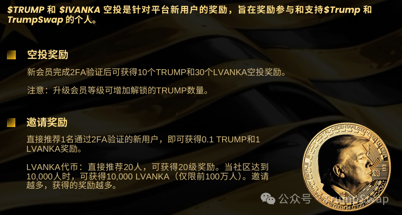 - 新用户注册:完成2FA验证,立即领取10枚TRUMP和30枚LVANKA代币。